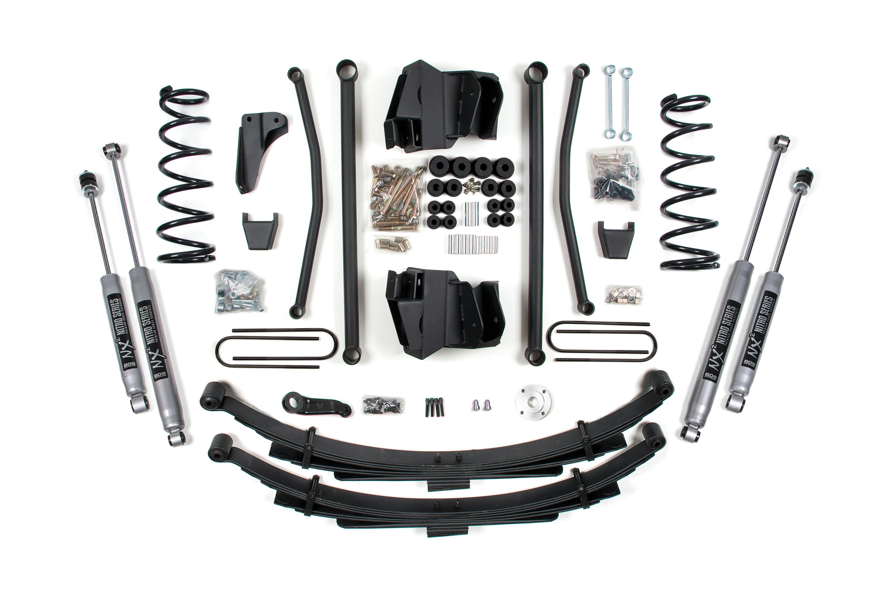Up front the lift kit includes diesel-specific Pro-Ride coil springs, all four control arms plus mounting bracket, forged drop pitman arm and track bar bracket for steering correction, bump stops, sway bar links, and precision tuned NX2 or FOX 2.0 nitrogen charged shocks. In the rear this kit utilizes heavy duty cast steel blocks, longer u-bolts, and a matching set of NX2 Nitro or FOX 2.0 Performance shocks.