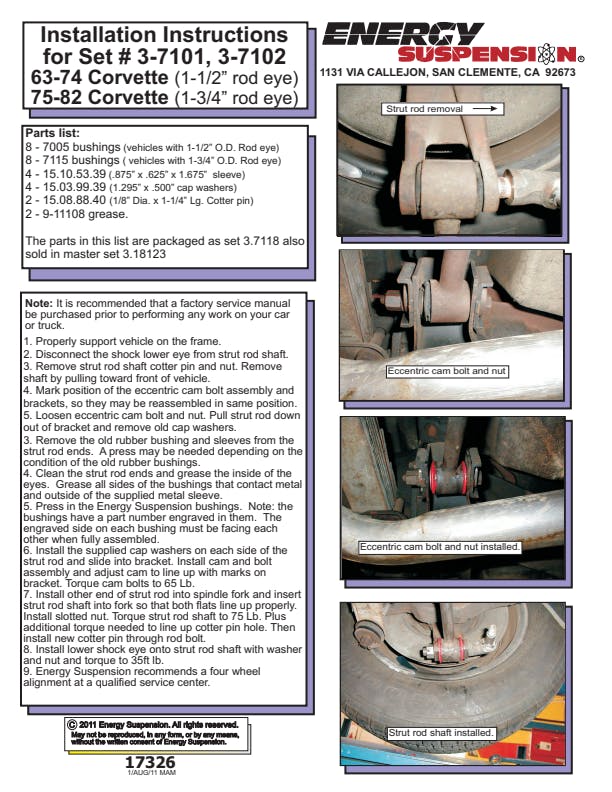 These performance polyurethane components help reduce common wheel roll-under. This occurs when stopping abruptly, especially when using performance tires. For both front of rear drive vehicles is so equipped. Replaces that original, short lived and too-soft O.E.M. rubber. On front wheel drive vehicles- diminishes wheel hop an d traction loss during standing start accelerations. Better maintains proper alignment under extreme conditions. Made of Energy's Hyper-Flex(TM) performance polyurethane to add both performance and durability.