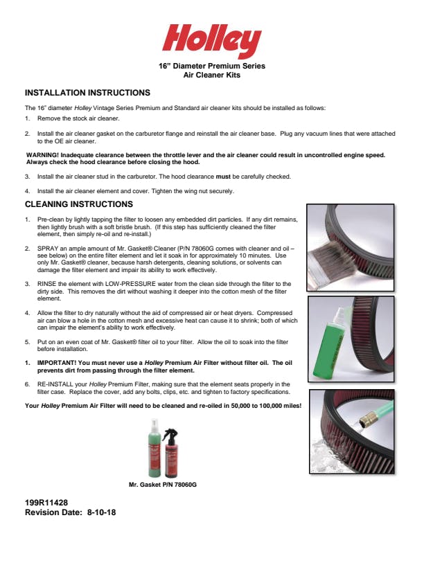 Holley is proud to offer another breath of fresh air with our new 16" drop-base 4150 air cleaner assemblies and filters. Available in 3", 4" or 6" filter heights and in chrome or EDP black. The assemblies are available with a red washable gauze element or a white pleated paper element to offer the look you have in mind. The tops are so large and smooth we decided to leave them plain for a nice stealth look, or to use as a canvas for creating your own look. They feature a 15/16" drop-base so hood clearance is gained above without creating clearance issues below.