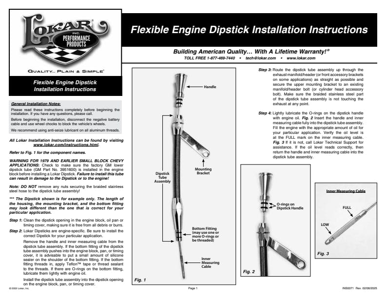 Black stainless steel housing. Slim design allows mounting inside the headers. For use with factory or sanderson cast manifolds. E-Z read flexible inner dipstick measuring cable. For Accurate measure of engine oil. Made in the U.S.A. Lifetime warranty.
