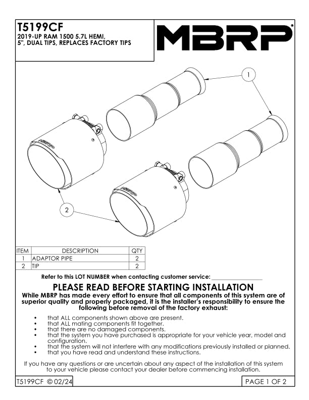 The exhaust tip is the crowning touch to your performance exhaust. It is your opportunity to really show off your personal style. That's why MBRP offers such a wide assortment of high quality, bolt on tips, because everybody has their own idea of style. MBRP offers T304 polished stainless, Black coated, Burnt End and Carbon Fiber tip options in various sizes. These Tips are vehicle specific.