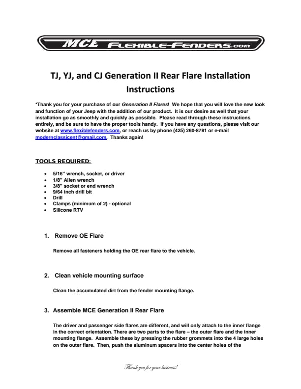 MADE IN THE USA. Our fenders blend the aggressive, true "flatty" fender look of the original Jeep to the more modern Wrangler. Our fenders also provide more clearance for a taller tire and more aggressive looks. The MCE-spec TPO plastic will not sag or crack, is UV-stable, and flexible enough to absorb an impact on the trail and save your Jeep's body (a common problem with rigid metal fenders is transferring energy to the Jeep's body, and denting the panel the flare is attached to). Our material is so strong, our fenders have a no fine print LIFETIME warranty to the original buyer against cracking. Cold weather, off-road use, etc. does not affect this warranty. Gen II fenders are black in color with an OE-like surface texture, while the Gen III flares are glossy smooth with a realistic carbon fiber look. MCE TJ and YJ front fenders are installed over a trimmed OE fender (cutting template and instructions supplied) so the inner fenders and the accessories mounted to them remain untouched.