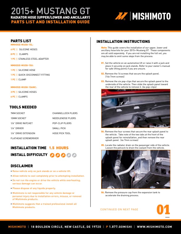 Upgrade your stock 2015-2023 Mustang radiator hoses with the Mishimoto Mustang upper radiator hose kit to provide your Mustang GT with an advancement in both style and reliability. This kit includes the upper radiator hose, as well as two worm-gear clamps for ease of installation. Unlike the degradation-prone stock 2015-2023 Mustang rubber hoses, every Mishimoto silicone hose is constructed from four layers of silicone with heat-resistant embedded fibers to provide unmatched durability, heat tolerance, and pressure tolerance. Whether you are racing your Mustang GT down the quarter mile or lapping at your next track day, trust Mishimoto with all your 2015-2023 Mustang parts. This silicone hose kit is available in black, blue, or red and, like all our Mustang GT parts, includes the Mishimoto Lifetime Warranty.