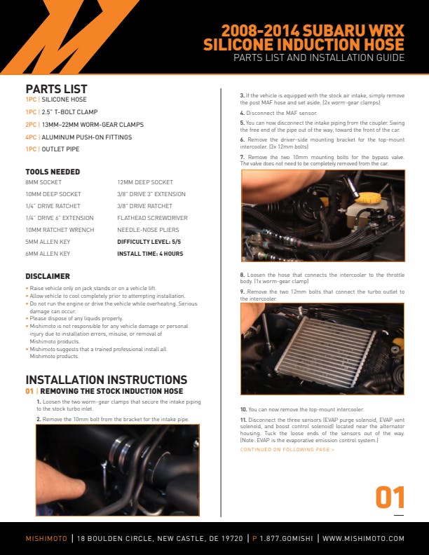 Mishimoto's Silicone Induction Hose for the 08-14 Subaru WRX is made from a combination of high-grade silicone and heat-resistant embedded fibers for a high-quality replacement for your stock hose.The Mishimoto silicone Induction Hose is wire reinforced to prevent collapsing under pressure and features increased flow thanks to a larger internal diameter. The accessory ports of this hose come with CNC aluminum fittings with a 3 barb design that will not fall out or leak under load. This hose also comes with everything you'll need for installation, including a robust 2.5in T-bolt clamp for the turbo as well as added worm gear clamps. Available in black, blue, or red, these silicone induction hoses retain stock fitment, the ultimate upgrade in performance and style. This hose will work with your stock after-MAF hose, Mishimoto Performance Cold Air Intake, or Mishimoto Performance Race Intake. As with all of our products, this hose comes with Mishimoto's lifetime warranty!
