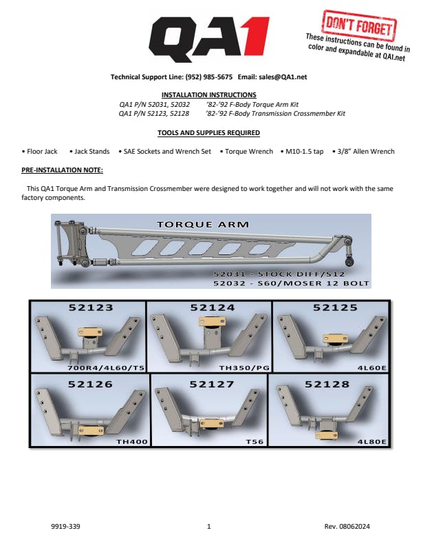 PRODUCT OVERVIEW If you are doing an engine and transmission swap or adding power to your 1982-1992 Chevrolet Camaro/Pontiac Firebird (F-body), a tubular torque arm and transmission crossmember from QA1 can make your swap much easier. This design is specific to several transmission models and relocates the torque arm mount off the transmission tail housing for QA1 tunnel mounted torque arms and provides a sleek, tight fit under your 3rd Gen. RELOCATED TORQUE ARM MOUNT The factory torque arm, which mounts to the tail housing of the transmission, is widely considered the weak link. If you've increased the power level of your 3rd Gen, damaged transmission tail housings can be a common and costly issue. This torque arm and transmission crossmember is designed to work with QA1's tunnel mounted torque arm, providing a stronger and more reliable solution. DIRECT FIT WITH POPULAR TRANSMISSION SWAPS The QA1 transmission crossmember is designed for a direct fit with several popular transmissions, ensuring compatibility and ease of installation. Specifically fitting TH350 and Powerglide transmissions, this product provides a hassle-free upgrade for your 3rd Gen Camaro or Firebird. THOUGHTFUL DESIGN QA1's transmission crossmember installs seamlessly, maintaining optimal ground clearance and exhaust routing. EASY BOLT-IN INSTALLATION The QA1 transmission crossmember features a bolt-in design, making installation straightforward and hassle-free. This allows you to upgrade your vehicle quickly without the need for extensive modifications or special tools. MADE IN THE USA QA1 suspension is proudly made in Lakeville, Minnesota. FITMENT NOTES Only compatible with QA1 Tunnel Mounted Torque Arms Fits cars with TH350 and Powerglide Transmissions