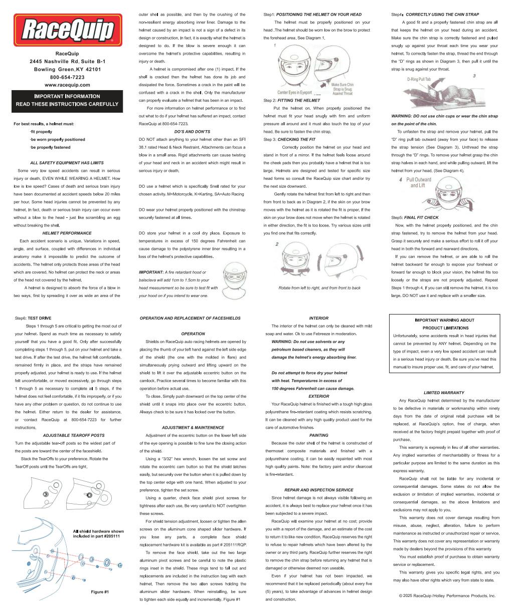 | Warning | WARNING: MOTOR RACING IS EXTREMELY HAZARDOUS! THIS ARTICLE IS SOLD WITHOUT WARRANTY, EXPRESSED OR IMPLIED, FOR OFF-HIGHWAY USE ONLY. NO REPRESENTATION IS MADE THAT THIS PRODUCT WILL PROTECT THE USER FROM DEATH, INJURY, OR WORSE. THE USER ASSUMES ALL RISKS INVOLVED WITH THE USE OF THIS PRODUCT AND AGREES TO HOLD THE MANUFACTURER AND DISTRIBUTOR HARMLESS. IF A SNELL, SFI, OR FIA CERTIFICATION IS AFFIXED TO THIS ITEM, IT HAS BEEN MANUFACTURERD TO SPECIFICATIONS SET FORTH BY THEIR ORGANIZATION AND HAS BEEN TESTED, APPROVED, AND CERTIFIED BY THEM. ALL GEAR SHOULD BE INSPECTED PRIOR TO EACH USE AND REPLACED IF PRODUCT SHOWS SIGNS OF WEAR OR THE PRESENCE OF ANY FACTORS THAT COULD COMPROMISE INTEGRITY. RACEQUIP IS A TRADEMARK OF HOLLEY PERFORMANCE PRODUCTS, INC., California Proposition 65 |