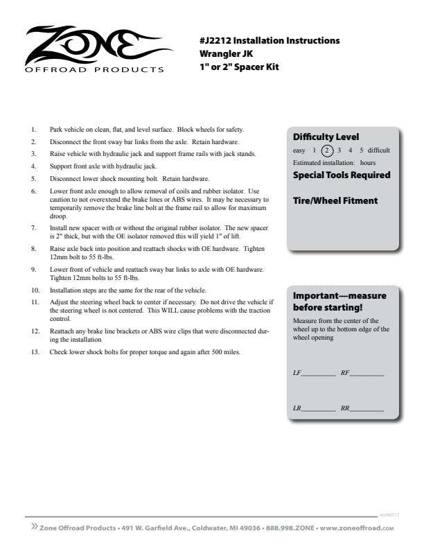 Jeep Wrangler JK's sit about 1.5 low in the front from the factory; add more weight from bumpers, winches, and tire carriers and you may find you could use a little extra boost in the front or rear. These front coil spring spacers are designed to give you that extra boost on a budget. They are easy to install and will maintain your factory ride. These JK specific coil spacers can be used to gain 1.75 of lift when installed with the factory spring isolator or approximately 1 of lift when installed with the factory isolator removed.